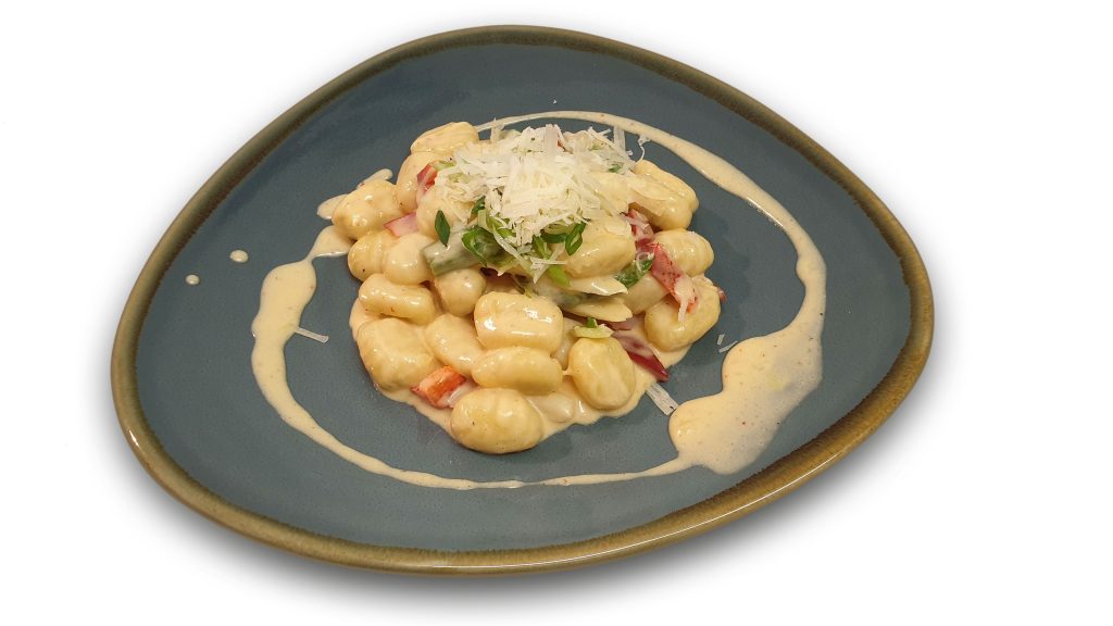 mit Kräuterkruste, Lammjus mit Sardellen, Basilico- Gnocchi, provenzalische Gemüse, Oliventapenade