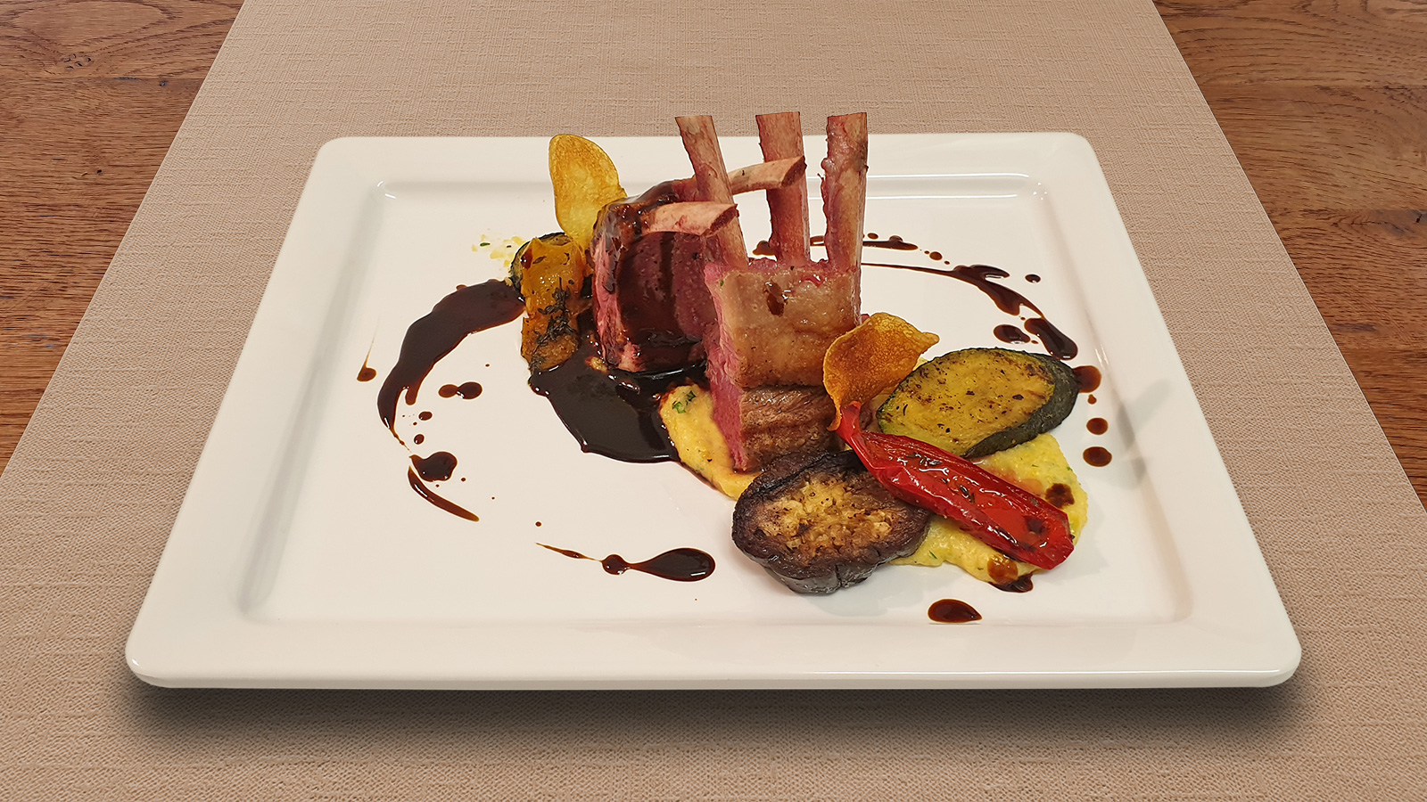 mit Kräuterkruste, Lammjus mit Sardellen, Basilico- Gnocchi, provenzalische Gemüse, Oliventapenade