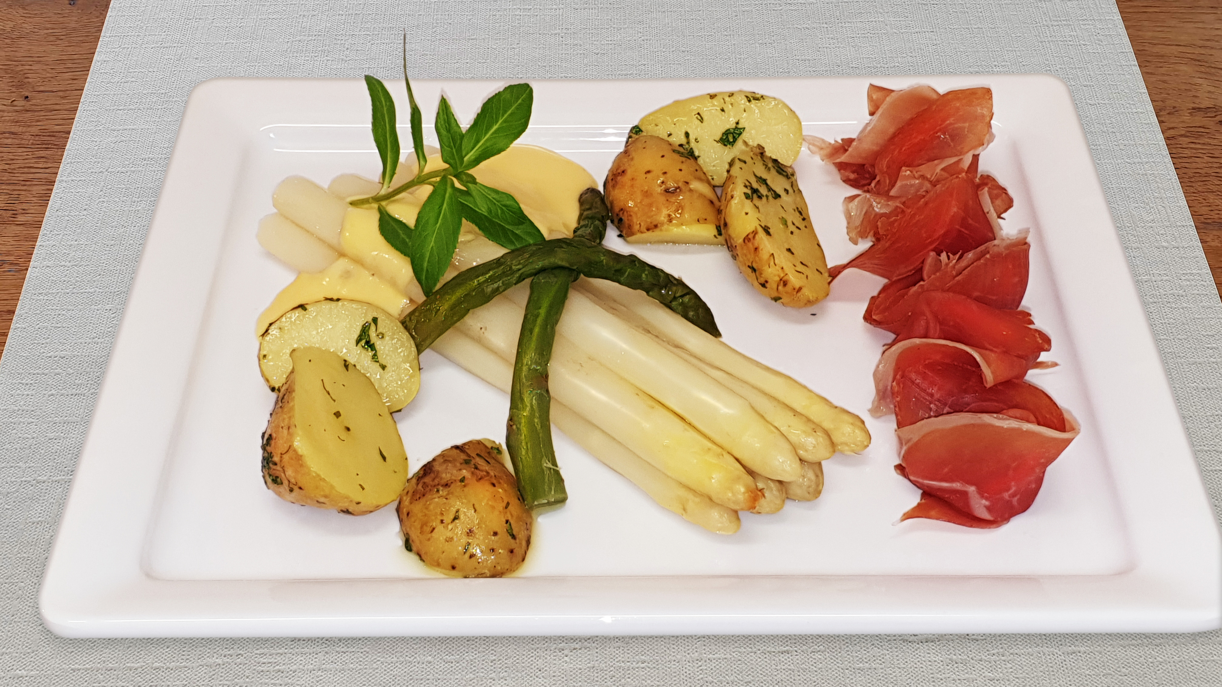 auf Butter gebraten, mit Martini und Weißwein gelöscht, Rosmarinkartoffeln